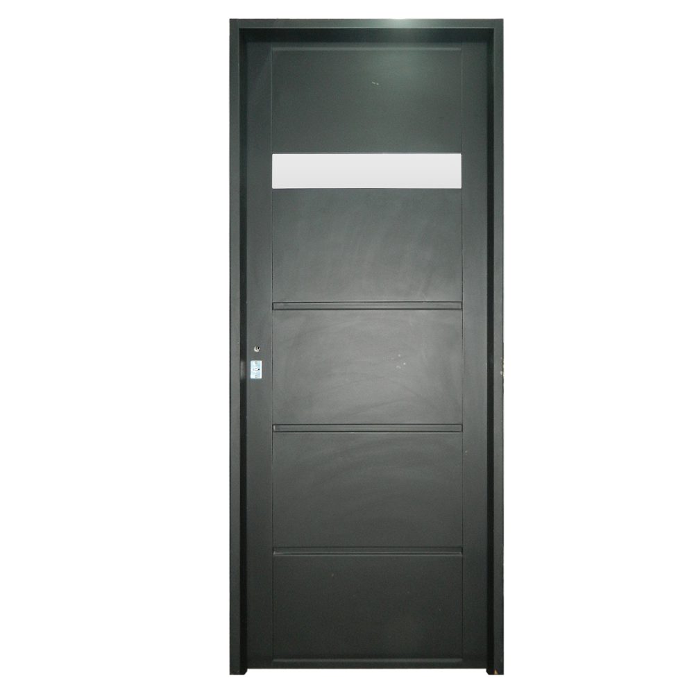 •Hoja: doble Chapa Nº18 con 3 bisgras munición, cerradura de seguridad doble perno, bocallave cromado, manijón de acero de 50cm, rellena con lana de vidrio de alta densidad de 50mm.